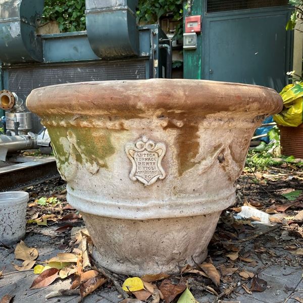 Di cui un grande vaso rotondo "Antica Fornace Berti e Figli" con decorazione a festoni e palmette ( 50 x 70 cm) e un vaso quadrato decorato a cesto di vimini ( 40 x 50 x 50 cm ) Lavorazione manuale.