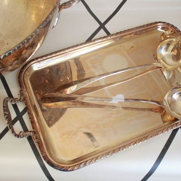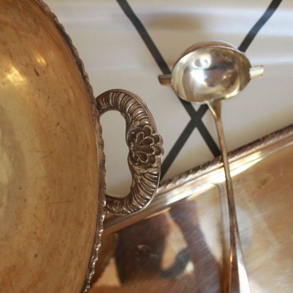 la coppa a due manici è da saldare, con bordi e manici decorati, mestoli Ricciarelli, vassoio a doppio manico in metallo argentato