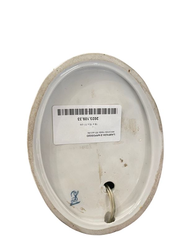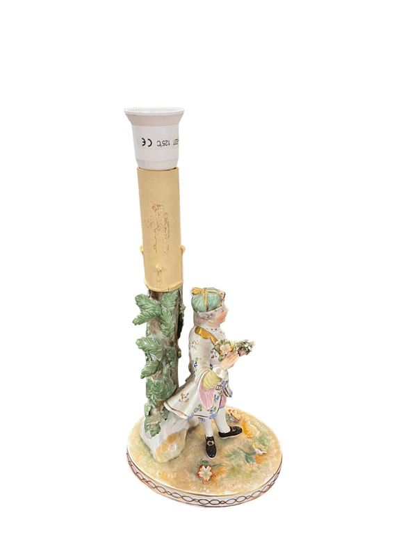 in porcellana policroma, con personaggio maschile appoggiato ad albero, in vesti settecentesche. Elettrificate. Porcellana tedesca. Minime mancanze