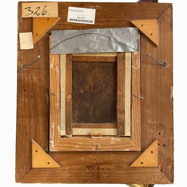 L'opera deriva dalla celebre 'Madonna della seggiola' di Raffaello. Entro cornice dorata.