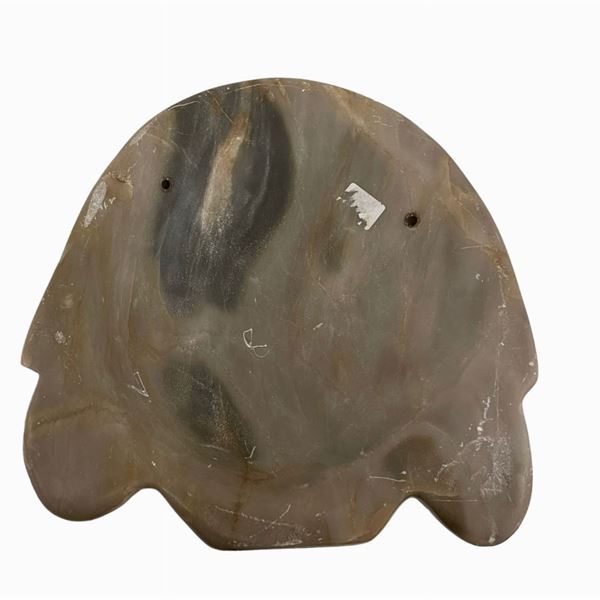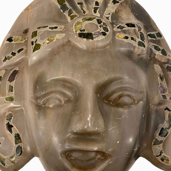 Scultura in forma, in materiale lapideo, con inserti a mosaico in marmi differenti.