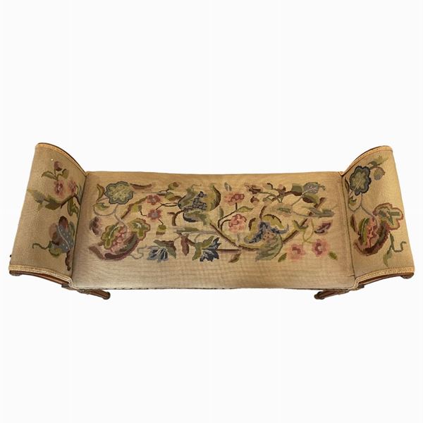 a due posti, in legno di noce, con lumeggiature dorate, di linea Luigi XVI. Manifattura italiana. Tappezzeria a mezzo punto.