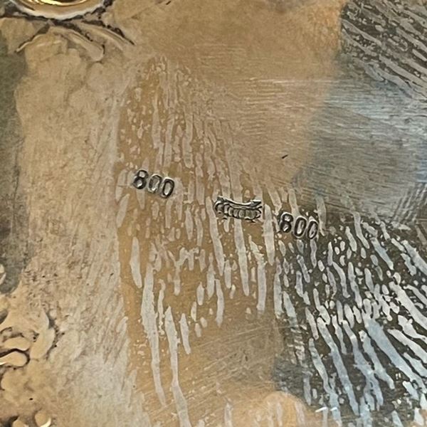 800 su 1000, parti sbalzate ed incise, di forma tonda, con tre piedi d'appoggio a virgola. Peso netto grammi 300.