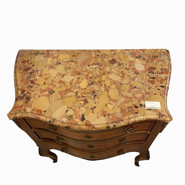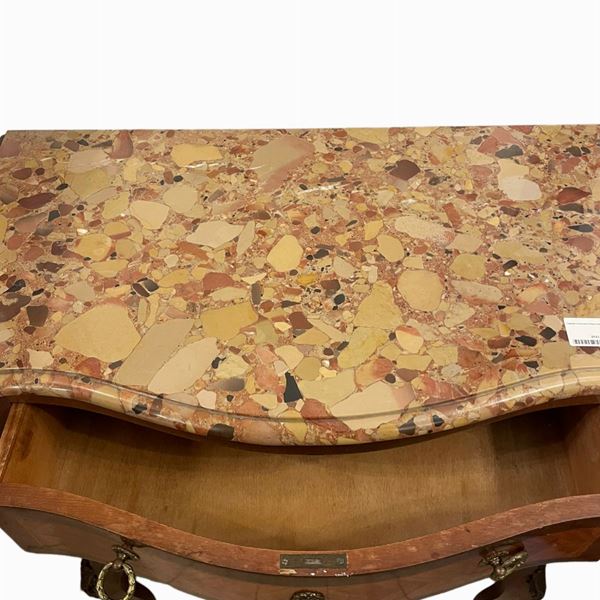 a tre cassetti, in legno di mogano e legno di rosa. Decori in bronzo, piano superiore in breccia di Aleppo. Manifattura francese