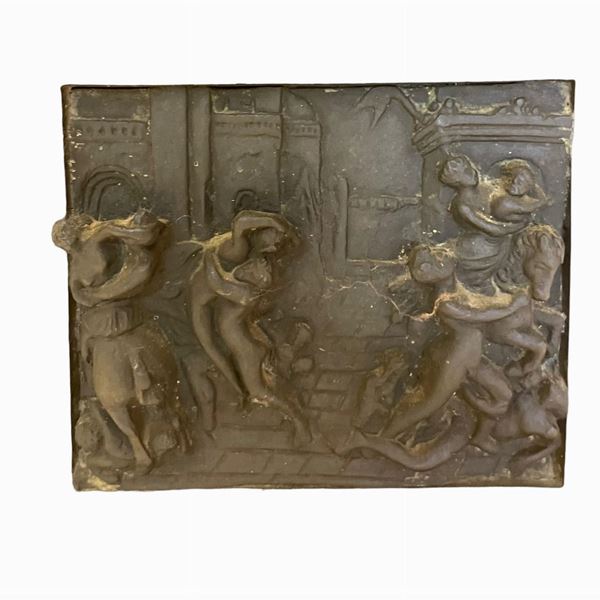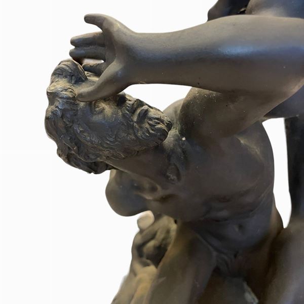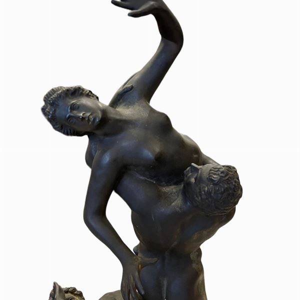 tratto dal gruppo marmoreo di Giambologna conservato nella Loggia dei Lanzi. Basamento con bassorilievo su lato frontale. In bronzo brunito