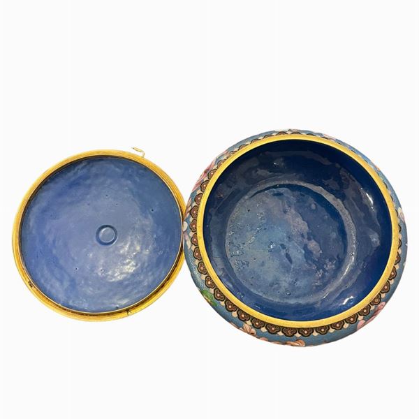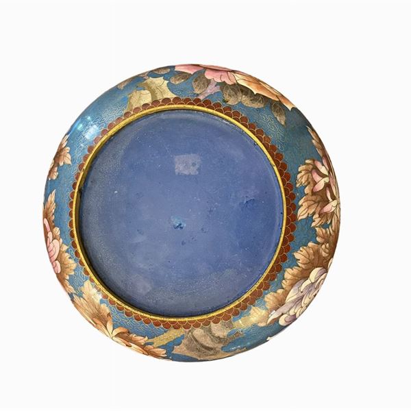 di forma a cipolla, in bronzo a fondo blu con decoro floreale alla peonia. Cina