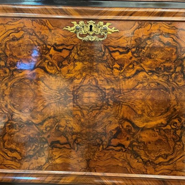 in legno di rovere e radica di noce e thuja, a quattro cassetti, con calatoia. All'interno carabattola, con cassettini e scomparti. Piedi a cipolla terminante con timpano a tulipano. Ferramenta in bronzo dorato con putti e maniglia. Riquadrature geometriche in legno ebanizzato. Francia del nord.