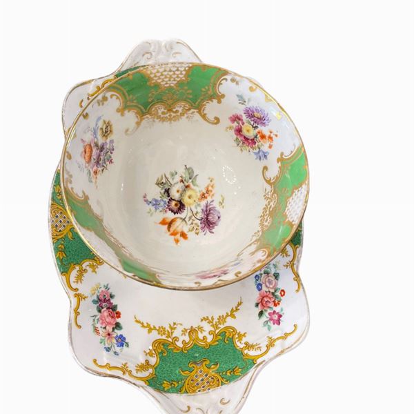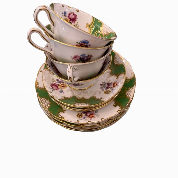 in porcellana bianca, con decoro floreale, e riserve verdi, con finiture in oro zecchino. Composto da: 6 piatti da dessert, 6 piatti da dolce, 6 tazze con piatto, 2 vassoi, 1 bowl, e 1 lattiera. Manifattura inglese. Totale pezzi 28