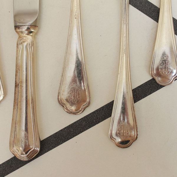 da 12 persone, composto da 12 forchette, 12 coltelli, 12 cucchiai, 12 forchette da pesce, 12 coltelli da pesce, 12 cucchiai medi, 12 forchette medie e 2 mestoli. Metallo argentato. Stemma dell'albergo sul retro alla base.