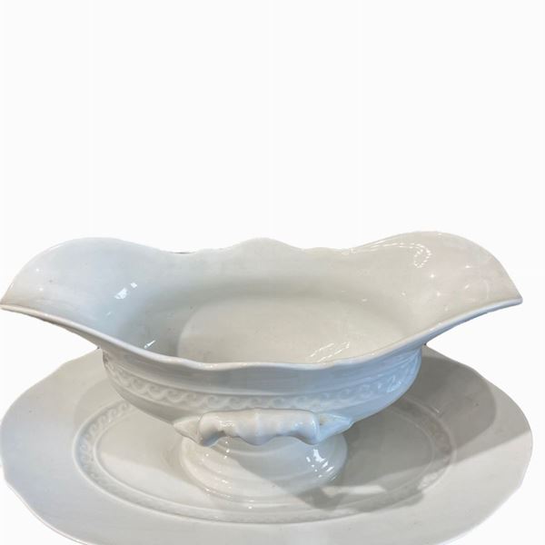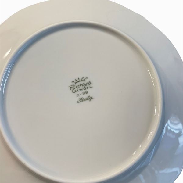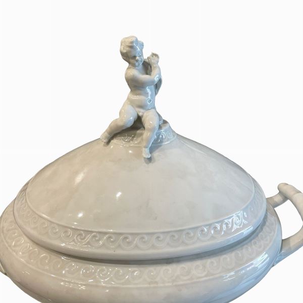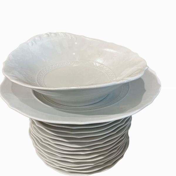 In fine porcellana bianca Bone China, composto da: 14 scodelle, 26 piatti da coltello, 26 piatti da dessert, 12 piatti da contorno, 1 zuppiera con putto al coperchio, 3 diverse salsiere, 4 piatti grandi da portata. Totali 86 pezzi. Manifattura Richard Ginori.