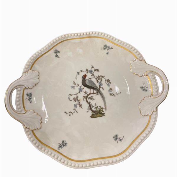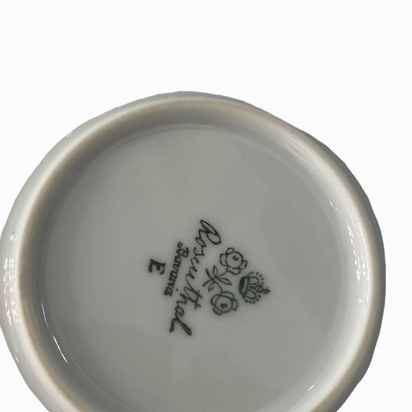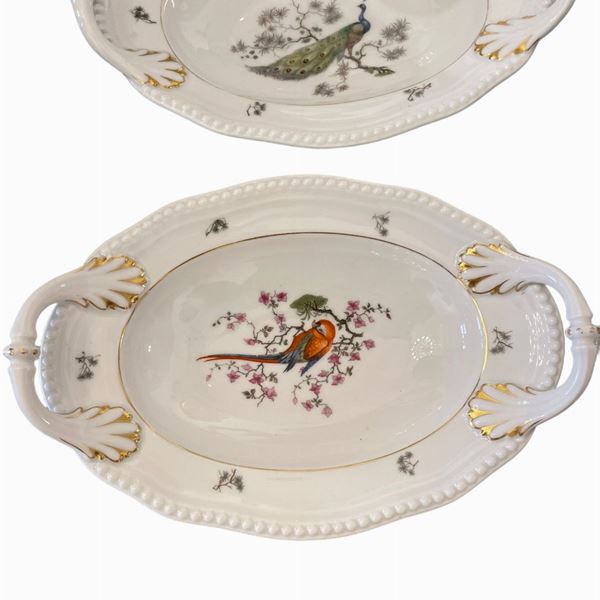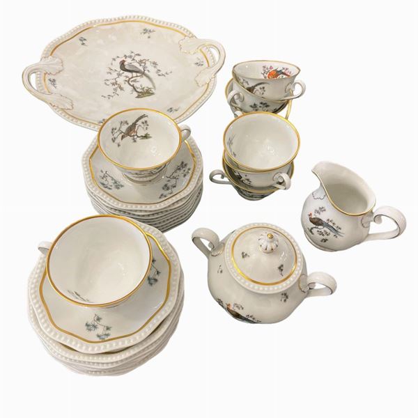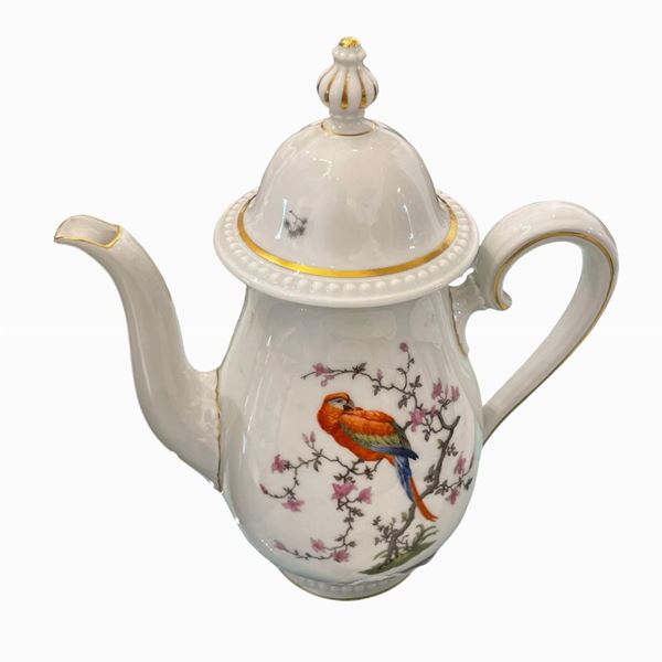 Servizio in porcellana bianca, con decoro floreale ed uccelli, pavoni e pappagalli. Finiture in oro zecchino. Composto da: caffettiera, lattiera, zuccheriera, 8 tazze, 19 piatti sotto tazza, 2 vassoietti ovali e 1 vassoio tondo portadolci. Totali 33 pezzi. Manifattura Rosenthal, Baviera. Forme e misure differenti