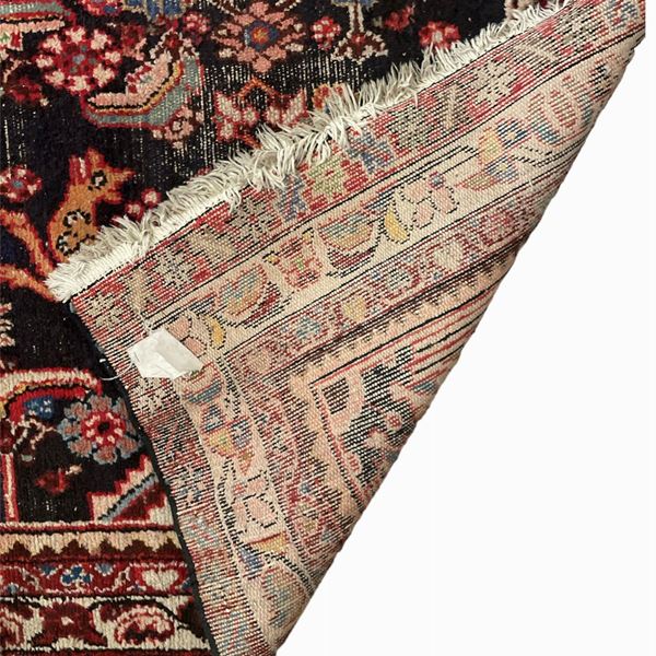 lana su cotone. Losanga centrale su fondo nero e bordura a motivi geometrici. Parti usurate.