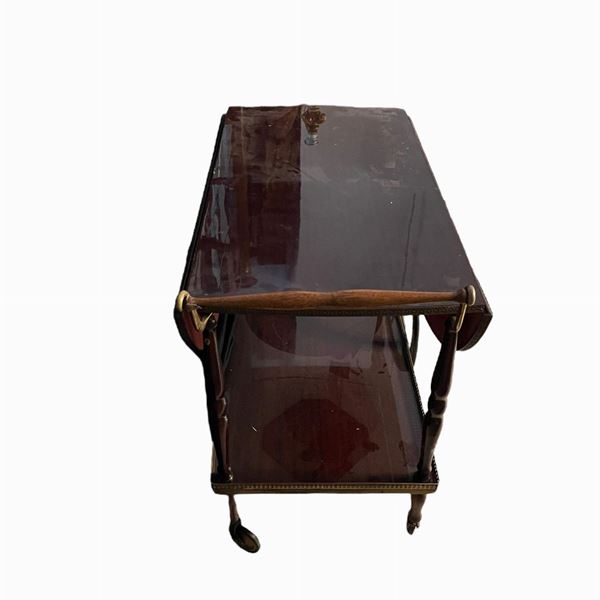 portavivande in legno di mogano, a due ripiani, con bandelle laterali. Manifattura italiana