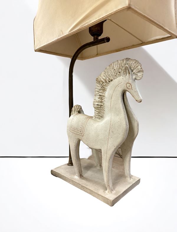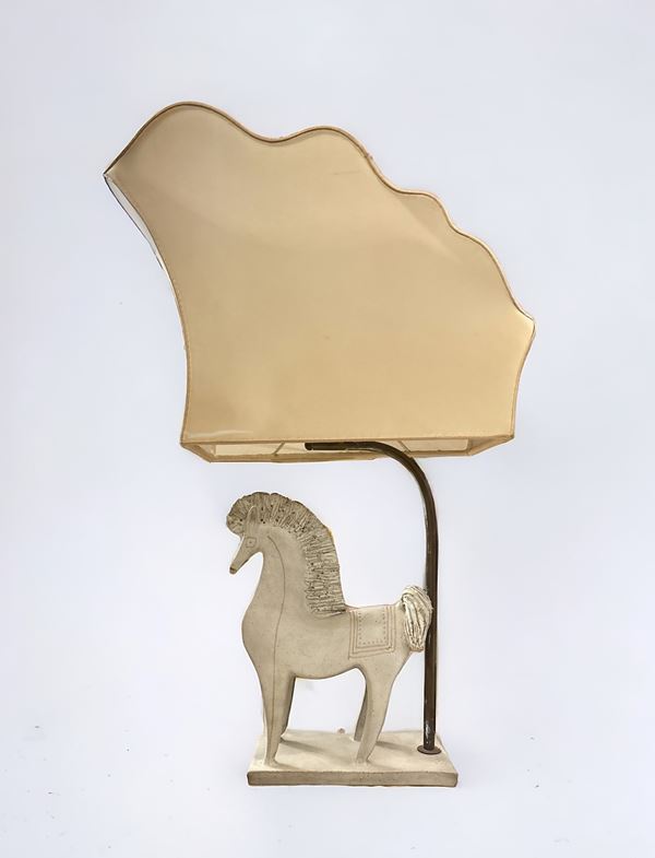 Firmata al retro della base: Gambone Italy. Dimensioni scultura con base: 35 x 24 x 14 cm;  dimensioni lampada: 78 x 38 x 20 cm.