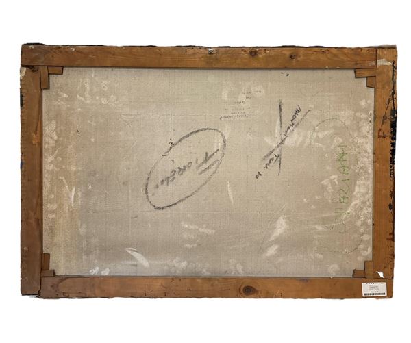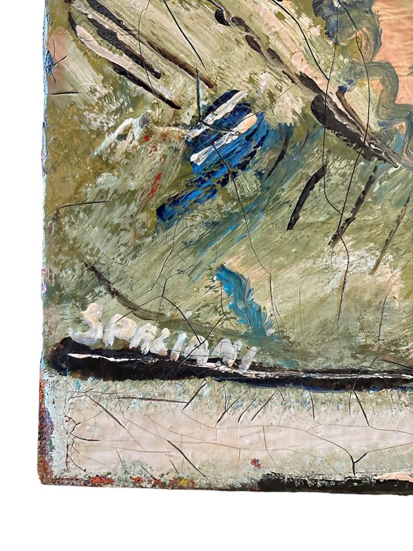 Firmato al retro Spaziani. Reca iscrizione autografa "Villaggi in festa, olio puro...... Spaziani, 1969". Piccoli difetti.