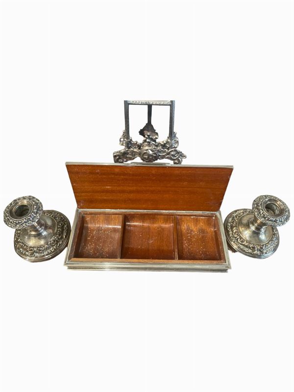 Coppia di portacandele (15 x diametro 10cm), un piccolo leggio (30 x 16 x 5cm), una bugia(15cm diametro) e un portasigarette in argento (5 x 27 x 11cm).