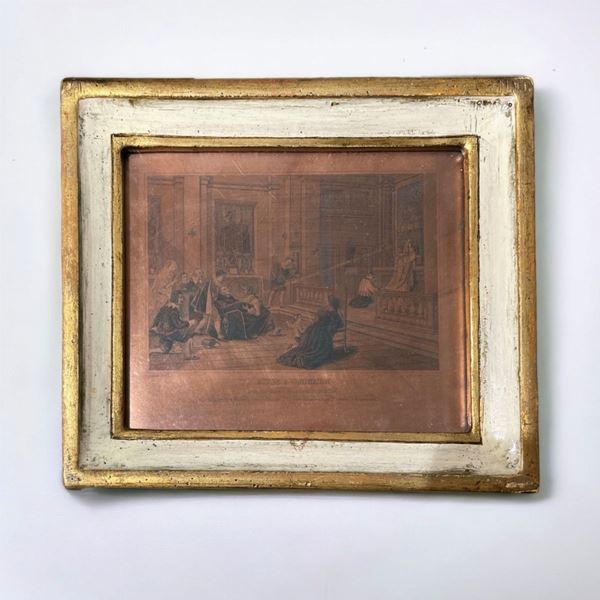 Matrici da stampa in rame in parte acciaiate, raffiguranti scene religiose. In cornice.