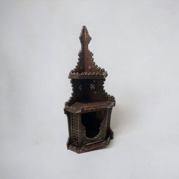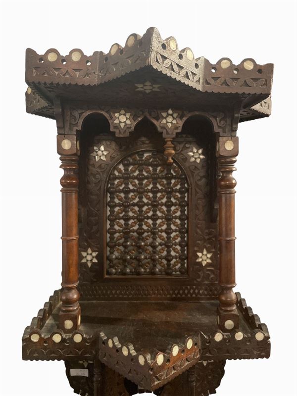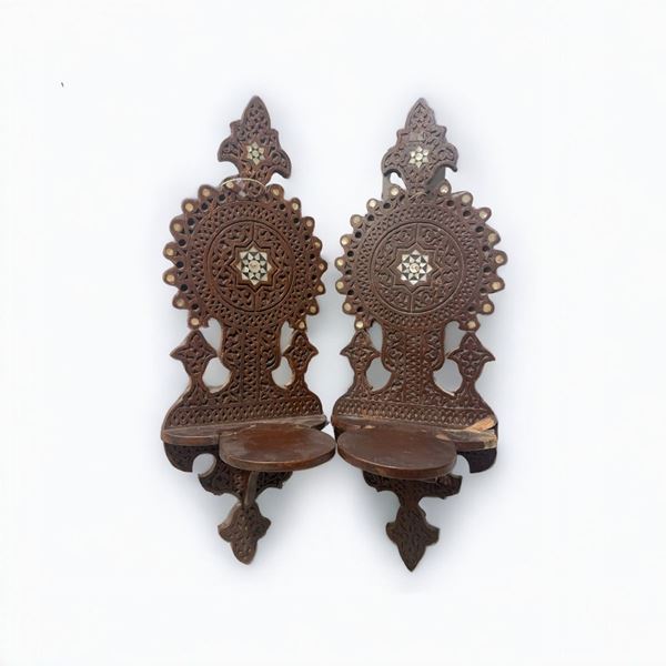 Composto da una mensola angolare a 3 ripiani (88 x 37 x 28cm), una mensola a due ripiani (80 x 40 x 22cm) e una coppia di mensole (58 x 19 x 16cm). In legno intagliato a motivi orientali con intarsi in madreperla. Difetti e mancanze.