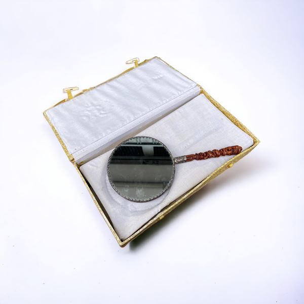 Specchio da toeletta con manico in legno intagliato e contenitore