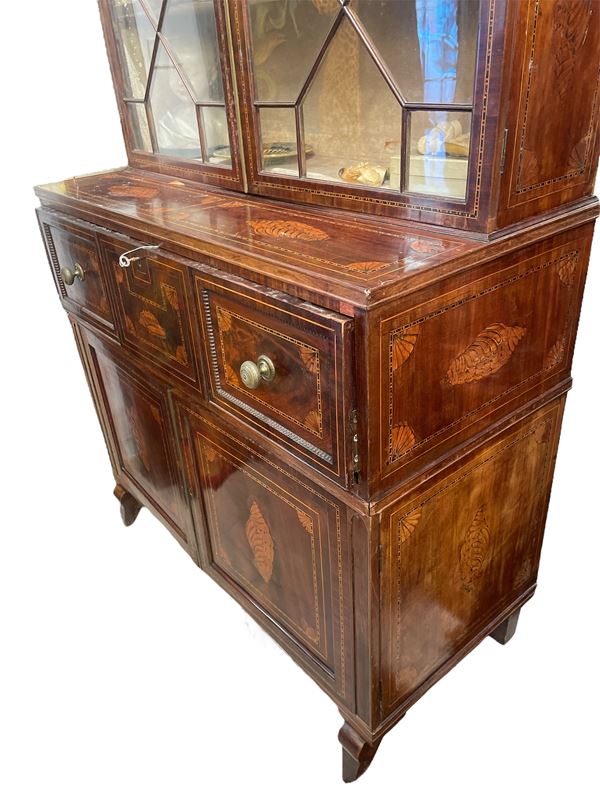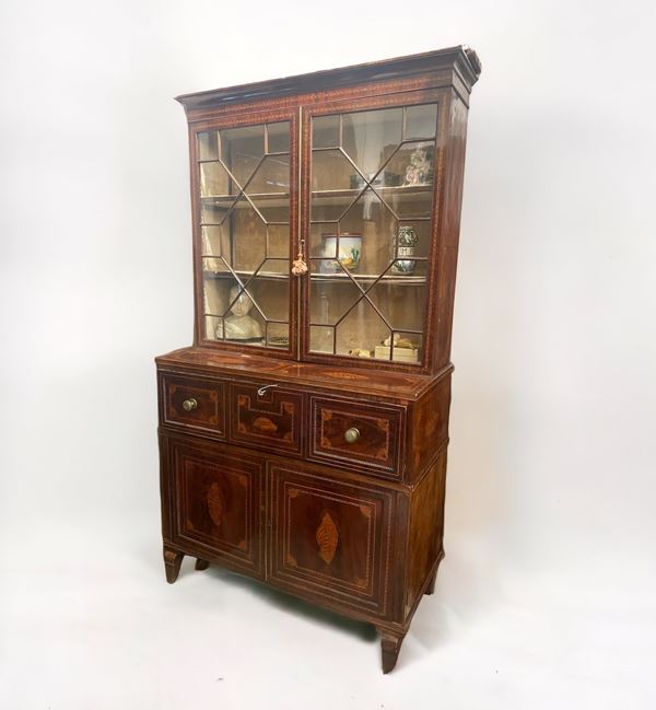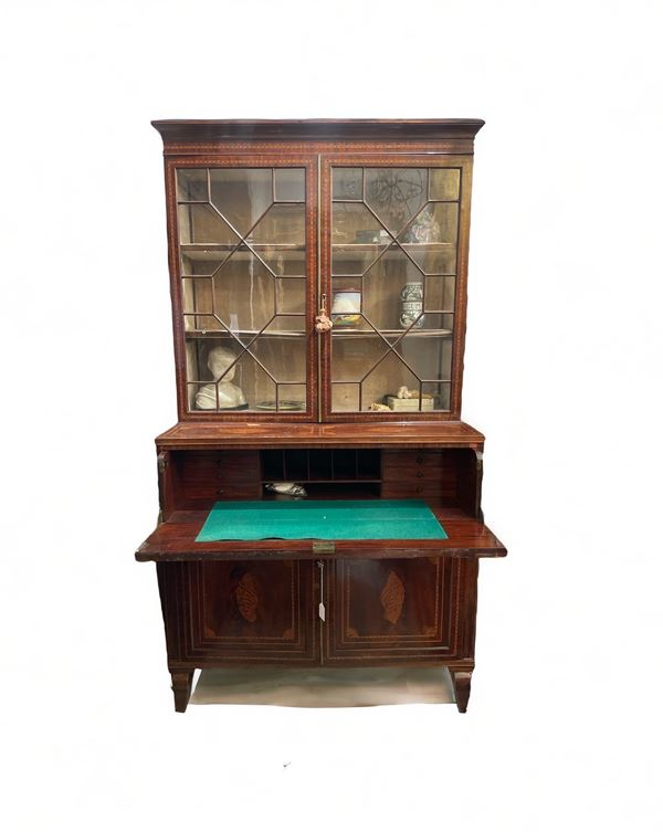 in legno di mogano, con intarsi in legno di frutto, con due sportelli, ribalta con cassettiera interna e due ante superiori a vetri con ferratelle. Restauri e mancanze