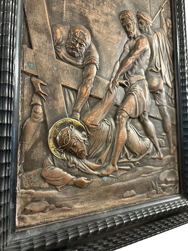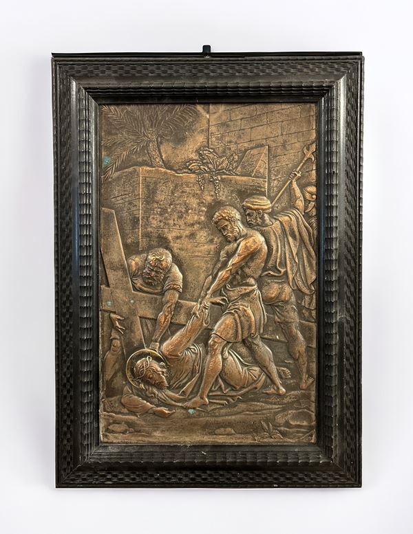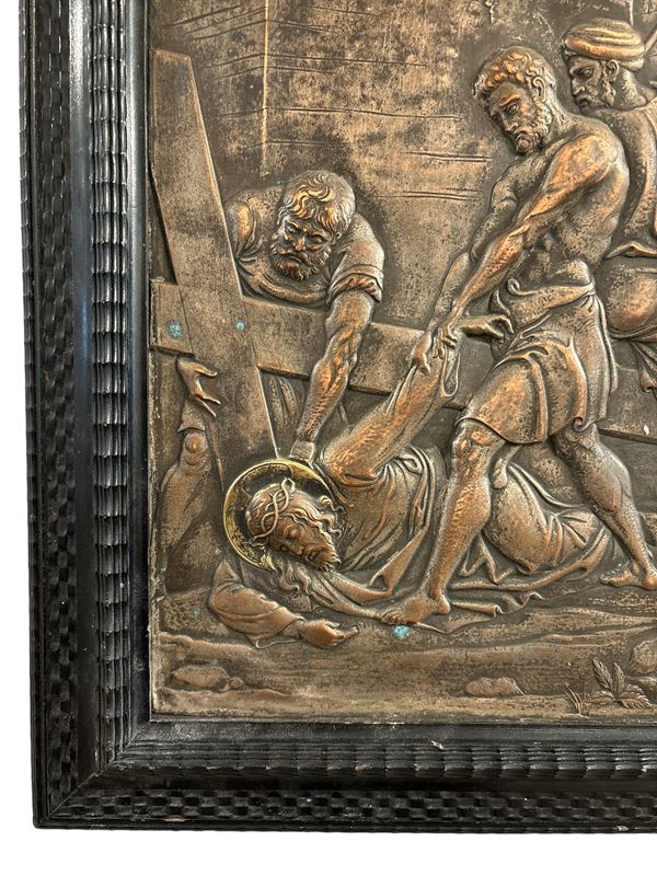 Bassorilievo in rame. Entro cornice in legno ebanizzato.