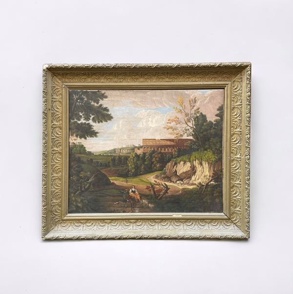 Paesaggio romano con Colosseo e viandanti, XIX secolo