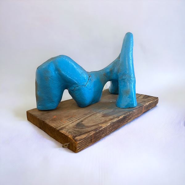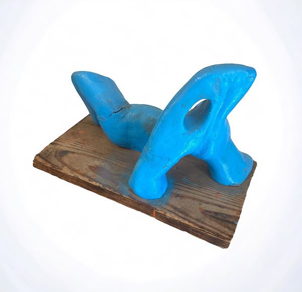 Scultura astratta in terracruda laccata azzurra. Firmato alla base Colangeli. Su base in legno. Difetti e rotture.