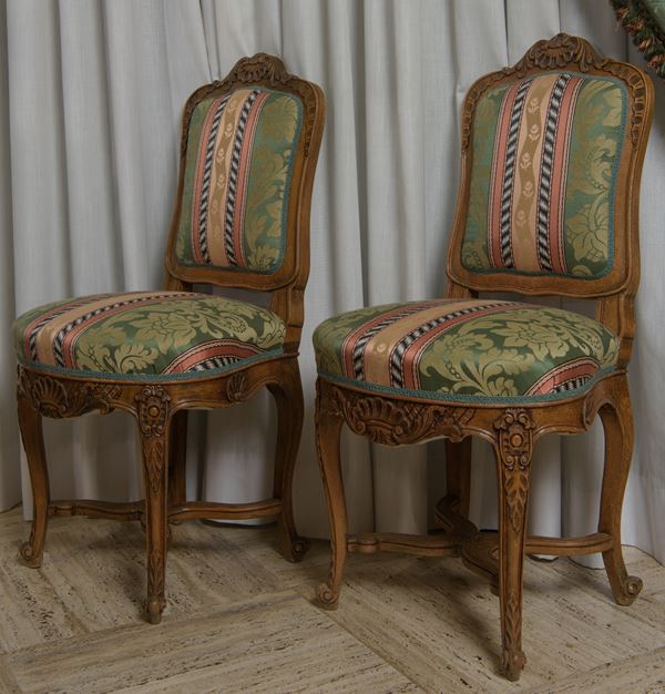 in legno intagliato con sedute e schienale in tappezzeria damascata. Di linea Luigi XV