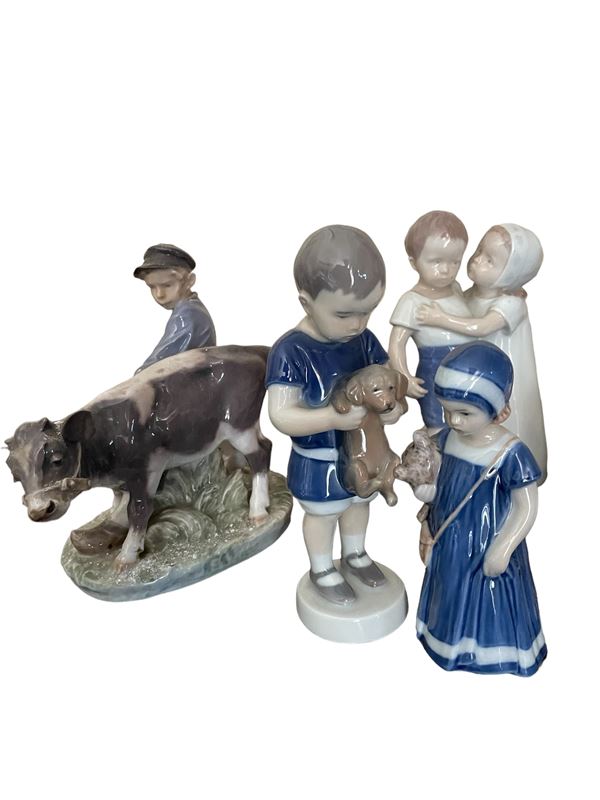 Composta da: Fanciulla H. 20 cm; Fanciullo H. 18 cm; Fanciulla che cuce H. 15 cm; Coppia di bambini H. 10 cm. Marchiati al retro.