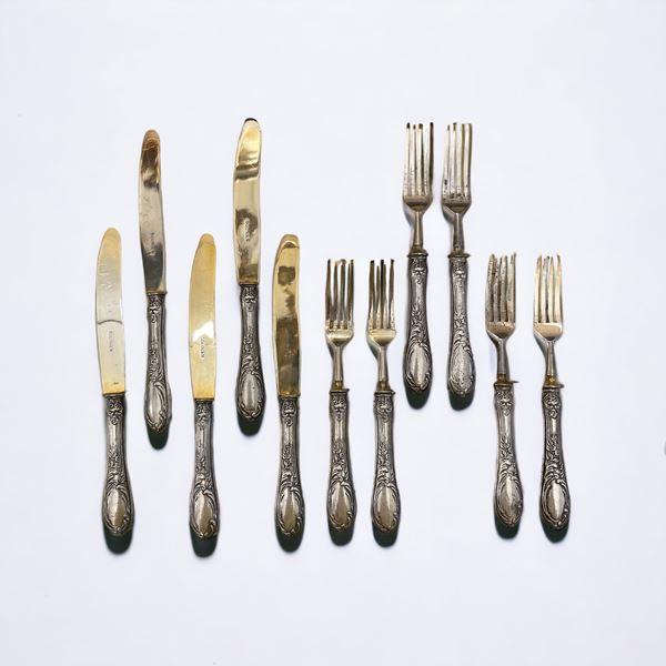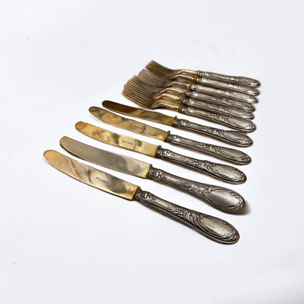 In lamina d'argento 800. Composto da: 6 forchette da frutta e 5 coltelli da frutta.