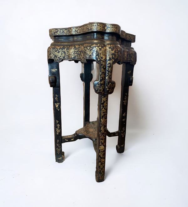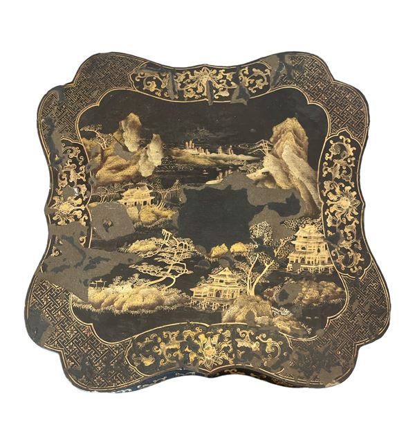 In legno laccato nero e oro a motivi floreali. Difetti e mancanze.
