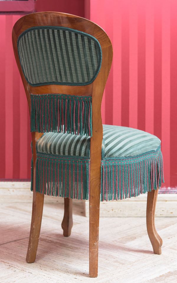 in legno di noce con tappezzeria a righe verdi con frange. Difetti.