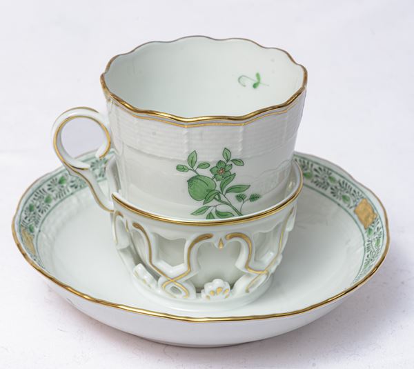 14 pezzi. Composto da: 6 demi tasse, (H. 8 cm); 6 piattini trembleuse; 1 piccola alzatina; 1 cioccolatiera. Dipinto a mano con rifiniture in oro zecchino. Marchio della manifattura con codice di riferimento in blu sottosmalto alla base.