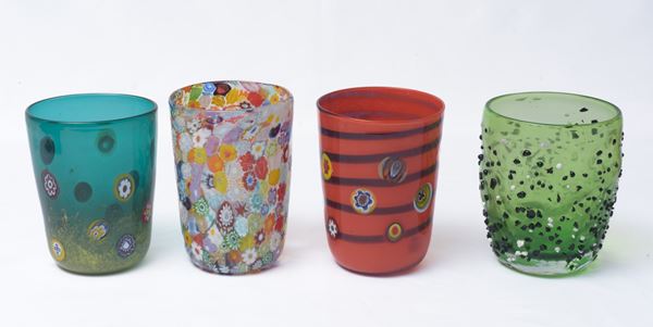 firma all'acido alla base "El Goto da Fornasi". Composto da: 3 bicchieri, mod. Arlecchino h 12,5 cm; 6 bicchieri mod. Dogi h 12 cm; 3 portacandela h 12 cm