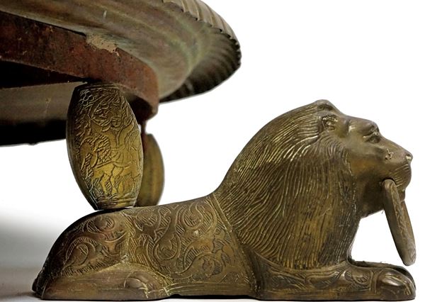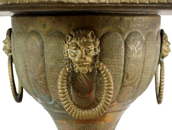 In ottone cesellato con decorazioni floreali e geometriche.
