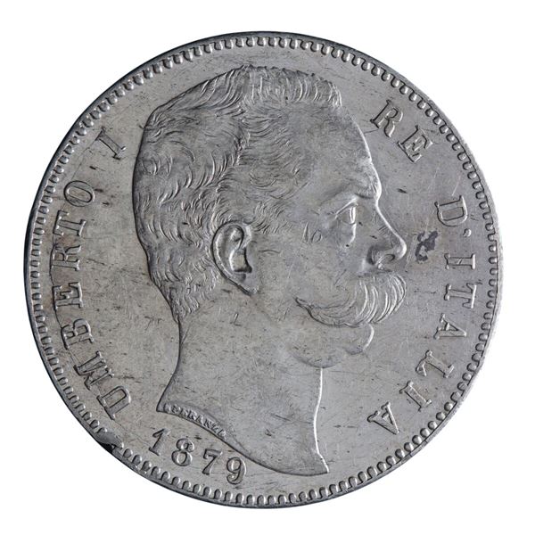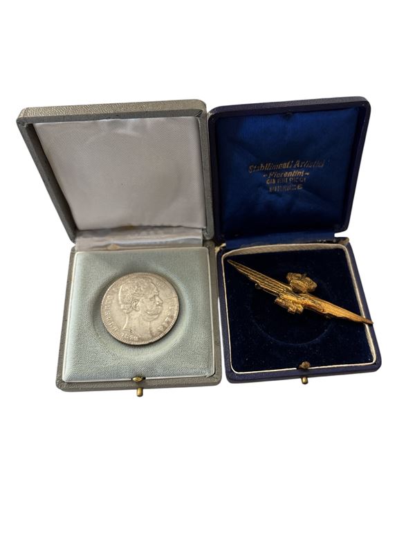 Distintivo da pilota militare, coniato in bronzo dorato, al verso attacco a gancio. Moneta da 5 lire del 1879 in argento.
