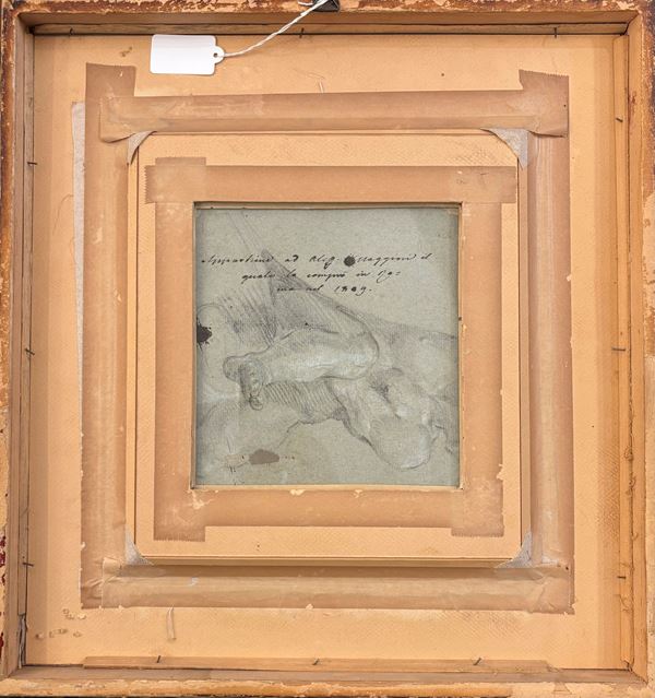 Fronte- Retro. Entro cornice. L'opera è firmata in basso a destra. Macchie di inchiostro. Iscrizioni sul fronte in basso a destra e al retro. Piccolo strappo in basso a destra.