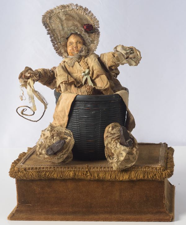 Bambola inserita in una cesta, vestita in stile vittoriano, con azione a meccanismo musicale (non funzionante) e una base rialzata.