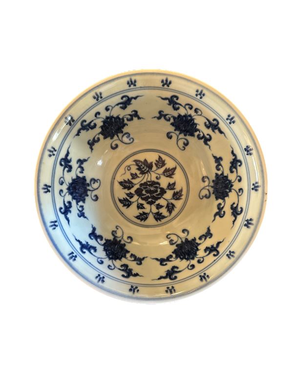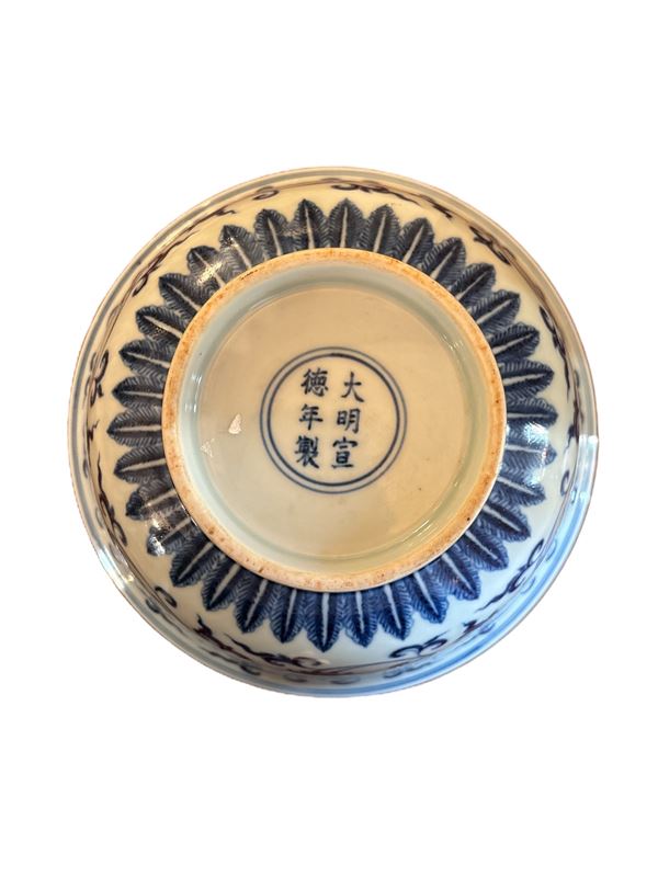 In porcellana bianca smaltata blu, con decori floreali. Marchio alla base.