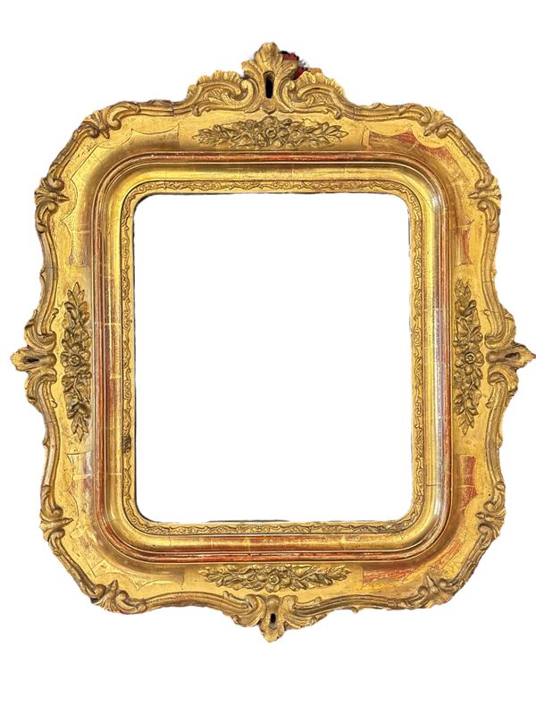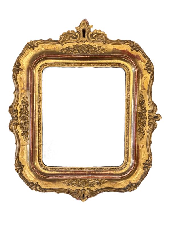 Di forma centinata. In legno dorato con applicazioni in pastiglia. Restauri e mancanze.