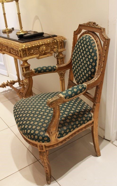 Con rivestimento verde a decori dorati, struttura in legno intagliato e dorato. Di linea Transizione. Manifattura francese. Piccoli difetti.