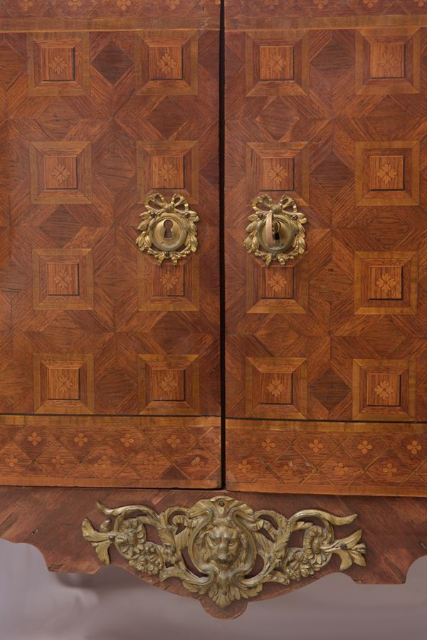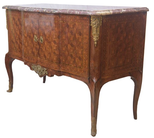 legni di ebano rosa, ebano viola e amaranto intarsiati a marchetteria. Guarnizioni in bronzo dorato e cesellato. Piano in marmo Fior di pesco.