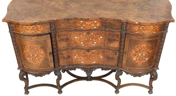 In noce, radica di noce e intarsi floreali in legni vari e avoriolina. Presenta due cassetti e due sportelli sul fronte centinato. Poggiante su otto piedi raccordati da crociera.