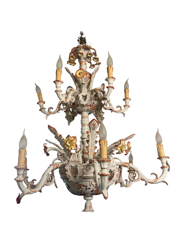 In porcellana bianca decorato a motivi floreali, a 12 luci. Probabilmente Bassano, metà XX secolo.