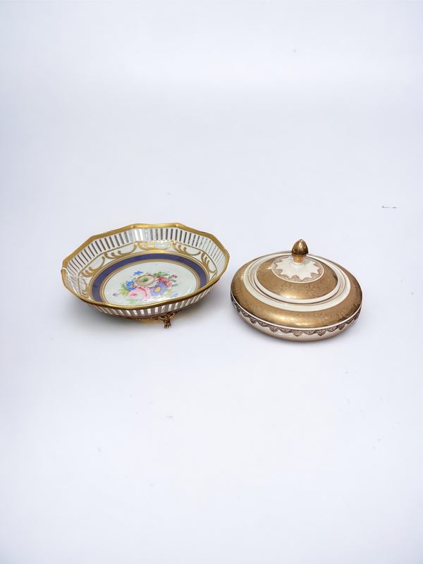 Composta da un centrotavola decorato a mano, moderna manifattura tedesca (6 x diametro 18,5 cm); un porta bon bon con coperchio Royal Bavaria (9 x diametro 14 cm) e bon bon in vetro colorato.
