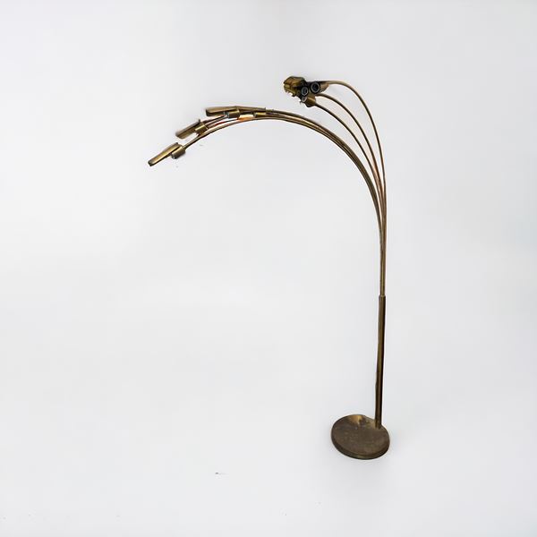 Attribuita a Gaetano Sciolari. Con 7 bracci ad arco, terminanti con semplici elementi in ottone atti a schermare la luce.