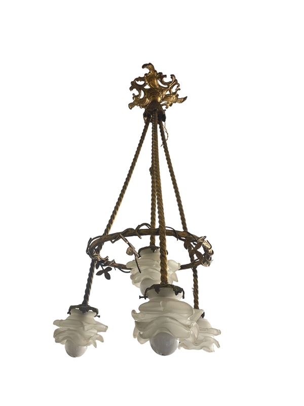 a quattro luci, con tulipe in opalina bianca e bronzo. Periodo Liberty.
