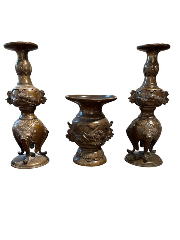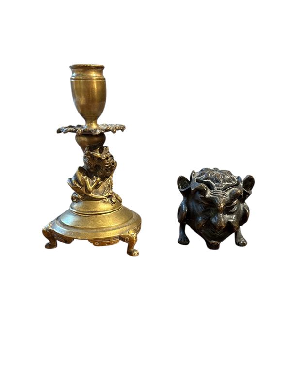 Composto da: trittico (vaso e coppia di portacandele), H. 20,5 cm; un porta candela (H. 15 cm); elemento in bronzo (H. 7 cm).