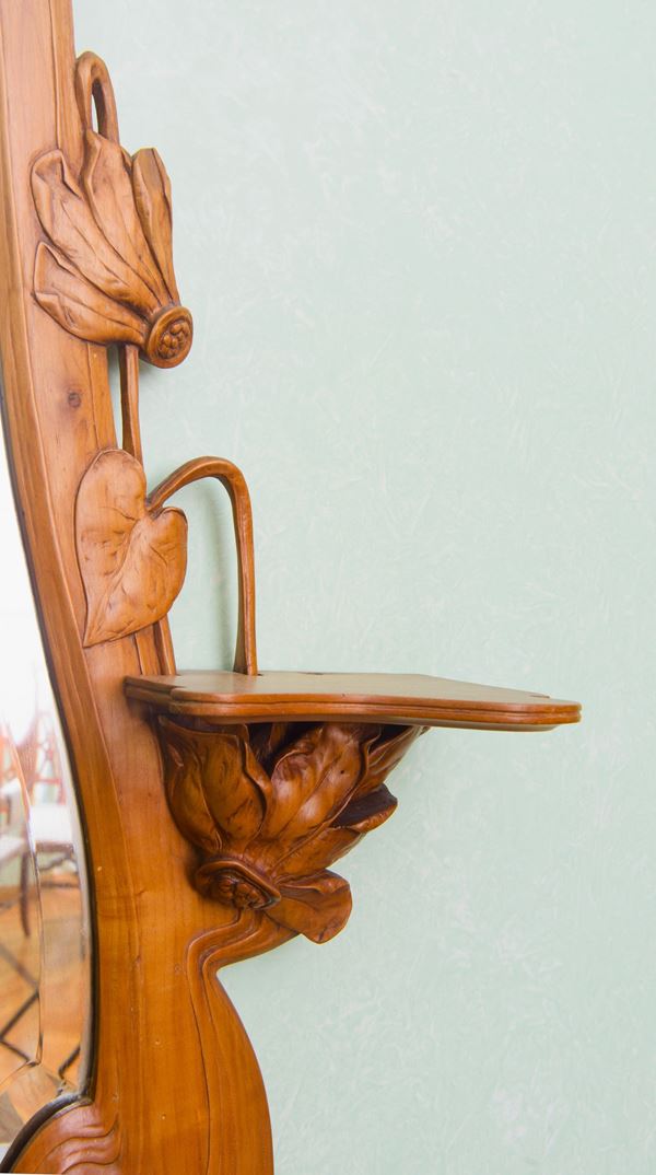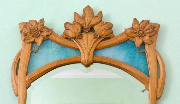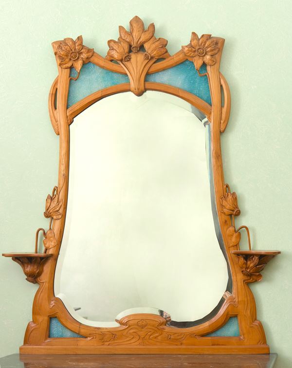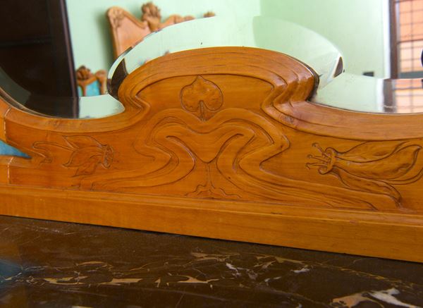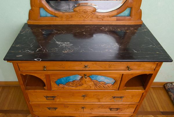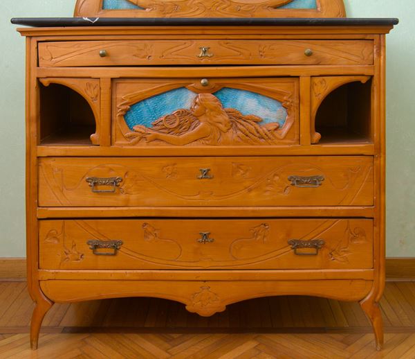 Cassettiera a tre cassetti, calzatoia centrale e ripiani laterali con alzata a specchio e coppia di mensole laterali. In legno di acero con inserti scolpiti a decorazioni floreali; marmo portoro e inserti in pasta vitrea color celeste. Dimensioni cassettiera: 106 x 120 x 65 cm;  dimensioni specchiera 143 x 121 cm.