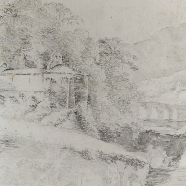 Paesaggio con scorcio di abbazia e monaci, Scuola europea - XIX sexcolo